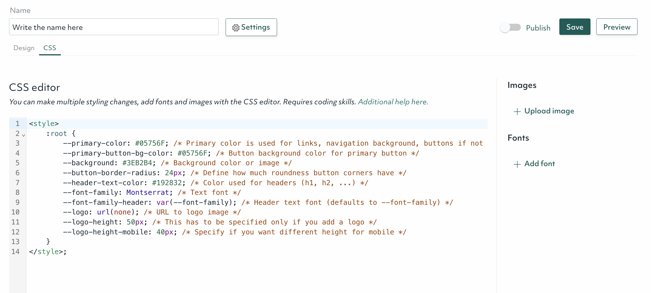 For more advanced designs please select to create the design with the CSS editor instead of the design editor. In the CSS editor it is possible to edit more elements if the design. Using the CSS editor will overwrite the changes made on the design editor side. More information about the CSS editor can be found in this article: Add new design.